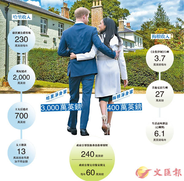兩人同時在新設官方網站sussexroyal.com上,公佈更多有關未來財務安排的細節,提到將會繼續保留去年花了240萬英鎊(約2,431萬港元)公帑大修的弗洛格摩別墅,並會繼續接受公帑提供的貼身警衛保護。兩人今後將不再從女王處領取「女王撥款」,並指該筆款項僅佔兩人公務開支的5%,不過會繼續從王儲查爾斯的私人財產中領取收入,以支付其他公務開支及私人花費。哈里及兄長威廉王子去年一共從查爾斯處獲得超過500萬英鎊(約5,065萬港元)收入,但未知兩兄弟如何分配。