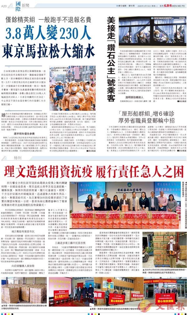 在打響全力對抗新型冠狀病毒肺炎疫情之戰的關鍵時期,全國政協委員、理文造紙主席李文俊迅速起動,積極無償、無條件捐款捐物資,履行社會責任。期間,千方百計從國內外組織貨源,迅速調集大批衛生用品、紙巾,無償派給市民,為日漸增加的防疫需求提供了切實的關愛和幫助。日前,香港海南社團總會舉行了簡單而隆重的理文造紙捐贈防疫物資儀式。