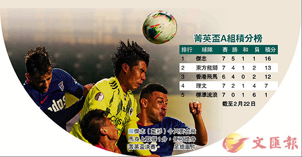 香港文匯報訊 (記者 黎永淦)菁英盃首個決賽席位極有可能於今日產生,A組榜首傑志只要在最後一場分組賽對香港飛馬保持不敗,即可以穩奪小組首名,率先奪得決賽資格。這場賽事今天下午1時正於賽馬會香港足球總會足球訓練中心閉門上演。