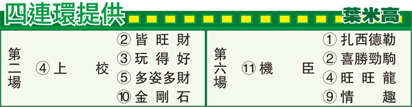第六場、第三班、二二○○米。「機臣」今季插三班評七十分起步的四歲自購馬,與早前打疊贏馬的「壽臣」以及「辣臣」一樣在澳洲出賽時已屬現馬主名下,屬自制自購馬身份,唯一不同就是此駒在澳洲由練馬師活侯夫人訓練,兩場頭馬均於悉尼取得,最後一戰跳班角逐一級賽南澳打m大敗而回,跑姿比較均速大步,是典型中長途「小法寶」子嗣模樣,何況大摩擅於訓練「小法寶」子嗣,過往旗下的「凱旋生輝」及「聰明才智」都贏過二班,前駒更於打m及遮打盃一級賽跑獲亞軍,訓練此系馬饒有心得,今次「機臣」值得留意。