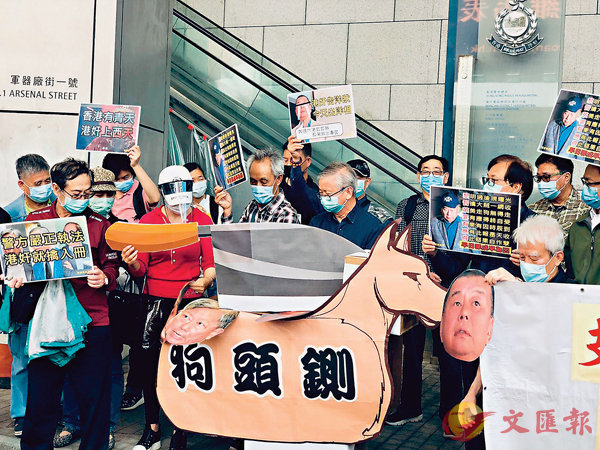 團體還以劇集《包青天》中象徵斬惡除奸的斬首刑具「狗頭鍘」為道具,一邊同呼「漢奸」,一邊將黎智英、李卓人等頭像照片逐一鍘過,寄寓執法部門定將依法嚴懲亂港幕後黑手,令香港早日回復安寧。