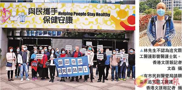 香港文匯報訊(記者 文森)「醫管局員工陣線」上月初發起罷工,企圖迫使特區政府對內地「全面封關」,有市民不滿有關行動影響抗疫工作,昨日下午到醫院管理局總部請願,要求醫管局嚴肅跟進事件,對參與罷工的醫護作出追究,並點名應開除發起罷工的「醫管局員工陣線」主席余慧明及副主席羅卓堯。