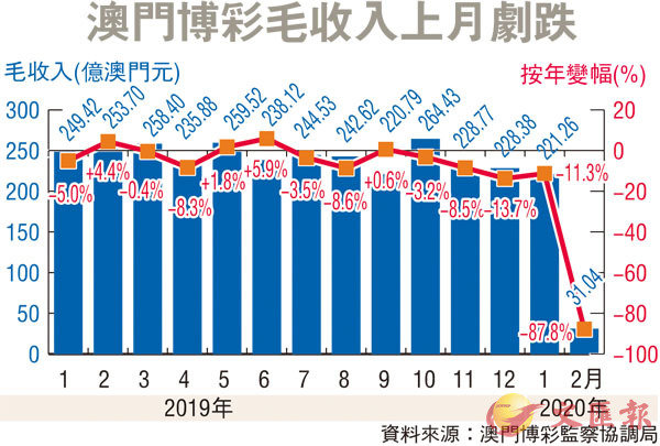 香港文匯報訊(記者 周曉菁)受新冠疫情影響,澳門博彩收入創歷史最大降幅。澳門博彩監察協調局發佈的最新數據顯示,2月幸運博彩毛收入同比下跌87.8%至31.04億澳門元,按月亦大跌85.97%,前兩個月累計毛收入按年縮減5成,至252.29億澳門元。