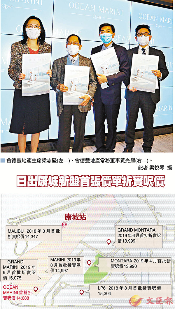 新冠肺炎疫情影響下,新盤開價變保守。會德豐地產旗下樓花期約兩年的將軍澳日出康城9C期OCEAN MARINI 昨公佈,首張價單共101伙,全部為兩房戶,平均呎價18,853元,扣除最高22.1%,平均折實呎價14,688元,較同系去年8月、9月推出的MARINI及GRAND MARINI首批折實實呎14,997元及15,075元略低約3%,472方呎兩房戶折實入場654.6萬元,折實入場呎價13,249元。全部單位折實價低於千萬元,70%單位折實低於800萬元。若用靈活「置業易」建期付款計,有76%單位低於千萬元,可申請八至九成按保。■香港文匯報記者 梁悅琴