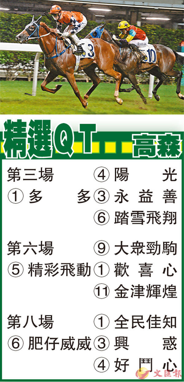 第三場、第四班、一六五○米。「多多」自從今季贏馬開竅後一直能夠保持穩定水準,其後三仗再添冠亞季各一,剛賽未能入圍只是因為直路被困馬林難以望空,今場如能順利望空衝刺,坐位望贏必可做到。「永益善」此程三勝八位路有專長,今季評分已屆有利水位,憑其可前置能後追跑法靈活,應可穩佔一席。
