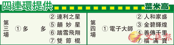 第四場、第四班、一二○○米。「電子大師」上季初在四班獲兩冠兩亞一殿,升上三班後至今季合計十三次上陣只得一亞兩季,評分最高去到六十六分,出戰三班賽難贏,但落到四班實力肯定綽綽有餘。此駒上季初除眼罩即贏,季尾初戴開縫眼罩,跑三班同程亦後上得第二,可見配備變動對馬匹產生刺激作用大;上次重返四班除去開縫眼罩,可惜因氣管有血而落第,今次W夠個半月,以季內跑三班谷草一千排十二檔亦能上名,如今在四班力足言勝。