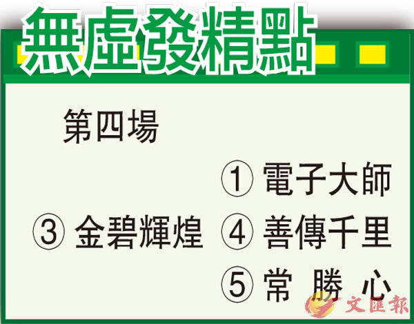 今晚跑馬地馬場將會上演八場賽事,使用C跑道向後移欄作賽,內欄向跑道中央移入八米,闊廿二點五米,直路長三百三十四米,比A跑道長廿二米,今次是季內第五次使用C跑道,上次使用是二月五日,當日草地度地儀指數為2.71,場地掛牌為好地。當日八匹頭馬之中只有「好友益」是排內檔起步,其餘七匹均排中外檔,由此可見當日的跑道有利中外檔馬。跑法方面,八匹頭馬之中只有「奇妙日」、「雷公鑿」及「非凡品味」三匹是使用放頭跑法,其餘五匹均使用後追跑法。當日的谷草C跑道有利後追馬。今季在谷草C跑道贏馬最多的練馬師是呂健威與姚本輝,各贏了五場。騎師方面,今季在谷草C跑道贏馬最多的是潘頓,贏了六場,之後是田泰安、何澤堯及利敬國各贏五場。今次睇好第四場丁冠豪馬房匹「金碧輝煌」,歷來谷草C跑道獲兩冠四亞一季軍,新勝而來續攻強項,有權梅開二度。