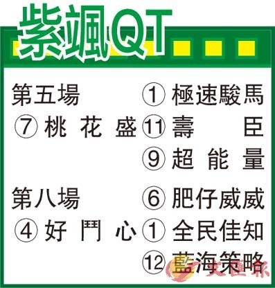 第八場、第三班、一八○○米。呂健威愛爾蘭自購馬「好鬥心」,來港前跑過五仗全是膠沙地,得兩冠一亞兩季,路程由千六至千七米。其父Holy Roman Emperor,屬○四年棗色愛爾蘭馬,出自Danehill一族,曾於兩歲時贏過四場,路程由千二至千四米,當中包括鳳凰錦標一級賽,已有子嗣在表列賽贏馬。在港同父馬有「金童」及「赤火神龍」等。其母Heart Of Ice,屬○六年棗色愛爾蘭馬,源自「望族」一族,兩歲時取一捷,至今誕下七匹賽駒,有五匹勝出。「好鬥心」在港最叻只在泥賽四度上名,從其同父兄弟馬多適合窄場進取,今次轉場確是有突擊本錢。