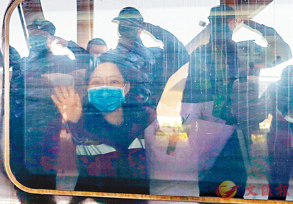 ■ 17日在武漢火車站,支援湖北的貴州醫療隊員向車窗外敬禮的武漢鐵路警察揮手致意。 中新社