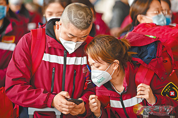 ■ 貴州醫療隊隊員李董江(左)的「人間有大愛」髮型。 新華社