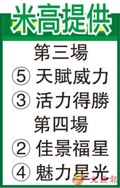 第三場、第五班、一八○○米。「天賦威力」呢匹北半球自購馬質素雖然唔高,不過勝在無傷病痛,在五班庸中佼佼,早前贏馬之後再出也曾經跑入三甲,長力十足兼反彈浪未完,今次只要起步搶出便有權直領到底。「活力得勝」最近一口氣四場俱跑入三甲,四歲當打馬距離贏馬只差一步,上場谷戰受制十二檔未竟全功,現返回田草上陣矢志爭取出頭。