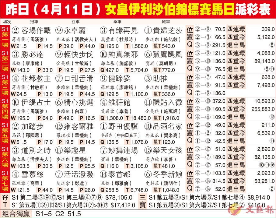 昨日(4月11日)女皇伊利沙伯錦標賽馬日派彩表
