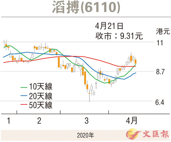 紐約5月期油崩瀉至歷來首呈負數,加上投資者對環球經濟前景憂慮加深,都利淡金融市場。外圍股市冇運行,昨日港股最多跌逾600點,收報23,794點,仍跌536點或2.2%,主板成交增至1,107億多元。滔搏(6110)近期彈力頗見不俗,惟大市跌勢轉急,該股也跟隨回落,一度觸及10天線(9.2元),收報9.31元,仍跌0.51元或5.19%,因其技術走勢未轉弱,可考慮趁調整收集。