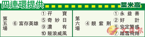 第五場、第四班、一○○○米。賀廄三歲馬「富存英雄」,早在八月一日出世,屬早胎南半球馬,周歲時由雅士牧場及練馬師魏明仕以十三萬澳元投得。若純以外貌,「富存英雄」為幾匹在港子嗣中最似其父「花旗」,稍不同乃其幼條白鼻生得較直,而「花旗」則是打斜的。「花旗」於澳洲出道,曾贏一哩考菲爾德堅尼,之後易主遠征英國攻陷金禧錦標及七月盃。「富存英雄」上仗在港初出田草直路賽,埋門票如雨下,最終跑第十一名以六乘見負,實際表現不算差,熱身後轉場有變數,有分頭可小試。