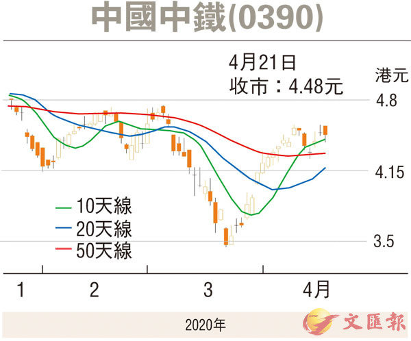 中國中鐵在昨日逾500點的跌市中,相對的抗跌力較強,收報4.48元(港元,下同),小跌2仙或0.44%。該股現價市盈率4.22倍,市賬率0.43倍,估值仍處偏低水平。就技術走勢而言,中國中鐵現持穩於10天、20天及50天等多條重要平均線之上,在股價逆市有勢下,料後市反彈的空間仍在,上望目標為5元關,宜以失守近低位支持的4.24元則止蝕。