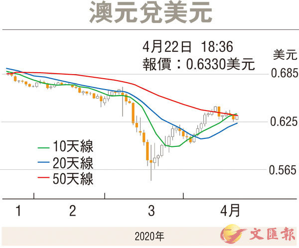 另一方面,原油價格本周早段急跌,連帶商品貨幣亦走勢偏弱,澳元周二再次跌穿63美仙水平。不過美國參議院周二通過規模約5,000億美元的新一輪疫情救助方案,預期美國眾議院亦將於周四通過該議案,加上美國聯儲局推行無限量寬之後,聯儲局公佈截至4月13日的資產負債表規模已擴大至63,678.87億美元,不排除第2季完結前將進一步膨脹至7萬億美元水平,該因素引致美元指數過去4周持續未能回升至101水平,美元升幅有放緩傾向,減輕澳元下行壓力,澳元現階段有機會處於橫行走勢。預料澳元將暫時上落於62.50至64.50美仙之間。