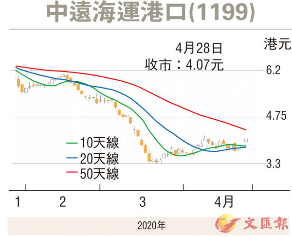 此外,截至今年3月底止,中遠海運港口首季營業額2.21億美元,按年跌11%。純利9,188.7萬元,按年升84.1%;每股盈利2.91仙。受新冠肺炎疫情影響,全球經濟已受到嚴重衝擊,集團首季純利仍錄得顯著升幅,已算有所交代。該股往績市盈率5.32倍,在同業中仍處於偏低水平,而股息率達7.49厘,論回報亦不俗。趁股價未發力跟進,上望目標為100天線的4.96元(港元,下同),惟失守近1個月低位支持的3.5元則止蝕。