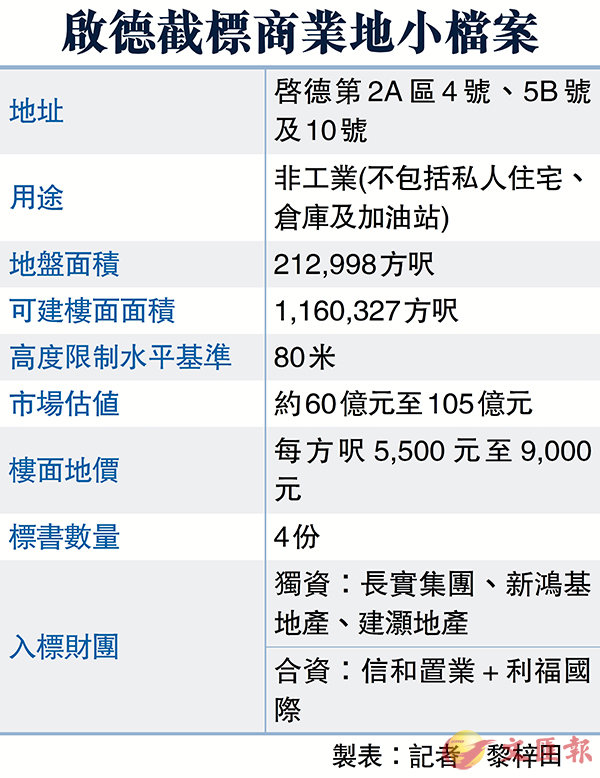 是次截標項目位於啟德2A區4、5B及10號,由三個地塊組成,面積分別約為7.06萬方呎、3.63萬方呎及6.57萬方呎,地盤位於地鐵沙中線宋皇臺站上蓋,項目地盤總面積21.3萬平方呎,指定作非工業(不包括私人住宅、倉庫及加油站)用途,可建最高樓面面積116萬方呎,屬目前區內規模第2大商業用地。