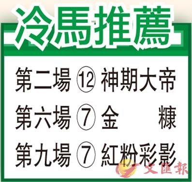 第六場、第三班、一二○○米。「金糠」在南非時由冠軍級練馬師史奈斯訓練,曾經出賽十三次,來港前最後一仗跑CTS短途賽,曾在霍勵賢胯下跑第三名;抵港後經過大半季時間適應水土環境,近期走勢已見漸入佳境,上場同程後上如飛,名次跑第九名實際少負三馬位而已,目前評六十六分比來港時已低十四分,估計已有迴旋餘地,提防在此平地一聲雷。