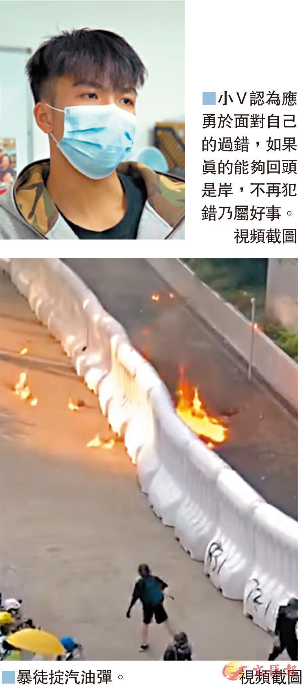 攬炒派鼓動青少年參與非法暴力示威,貽害無窮。一名曾參與暴力示威活動的少年「小V」親身剖白,表示當時是受到朋輩的影響,但在示威現場的所見所聞,包括見到同齡的年輕人向警察投擲汽油彈及雜物,還有朋友因此被捕而感到後悔,令他變得清醒。小V認為應勇於面對自己的過錯,如果真的能夠回頭是岸,不再犯錯乃屬好事。