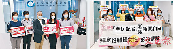 就網媒《全民記者》記者日前網上直播期間追蹤拍攝及評論兩位女警胸部,民建聯婦女事務委員會及「萃妍協會」昨日到平等機會委員會投訴,要求平機會依既定機制及法例跟進。平機會呼籲受屈人能挺身而出親自投訴。警方回覆香港文匯報查詢時表示,正積極考慮向平等機會委員會作投訴。左圖為民建聯婦女事務委員會(香港文匯報記者 攝);右圖為婦女團體「萃妍協會」 。 文:香港文匯報記者 黃書蘭、子京