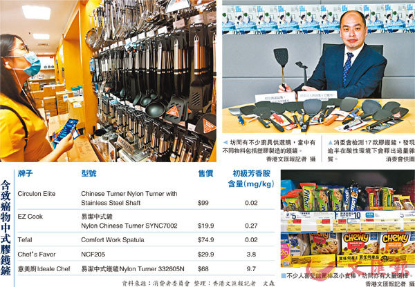 調查還發現,有5款膠鑊鏟,每公斤含0.02毫克至9.7毫克不等的「初級芳香胺」,這是一種含胺類化學物質,可用於生產工業用的偶氮染料以及某些聚合物,被國際癌病研究組織定為可能令人類患癌的物質,可透過廚具、食物包裝等遷移至食物,按歐洲標準,是不能驗出有關物質的。