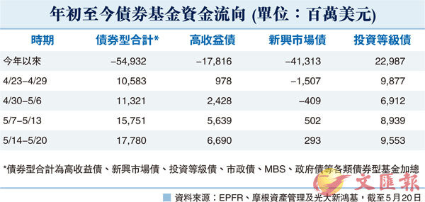 若發債企業無法償還本金,或未能根據協定繳付票息便屬違約,而相關風險往往於經濟不景時尤為顯著。縱使現時不少較低信貸評級,而票息吸引的高收益債,其估值已跌至相當吸引的水平;但投資級別債券(穆迪評級由Aaa至Baa3,標普則是由AAA至BBB-)償還本金及利息方面能力較佳。根據EPFR的數據顯示,年初至今投資級別債券基金持續錄得資金淨流入(表),反映投資者面對環球經濟前景未明,傾向選擇投資級別債券,以減少違約風險。