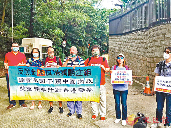 團體「反黑金反港獨關注組」一行八人,昨日下午由中環纜車站遊行至美國駐港澳總領事館外,他們沿途高叫「支持訂立港區國家安全法」、「支持香港警察嚴正執法」等口號,並提醒美國政府先處理好本土的疫情及暴亂問題,勿干預中國內政及插手香港事務。 ■香港文匯報記者 子京