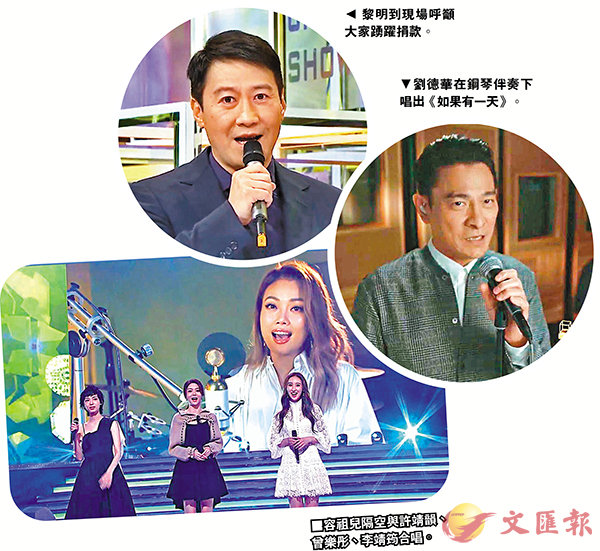 劉德華接棒讀出熱線呼籲大家支持公益金及時抗疫基金,並以鋼琴伴奏唱出甚有意思的勵志歌《如果有一天》,這也是疫情以來,兩位天王首次在香港的節目同台亮相。容祖兒了解到疫情下有不少家庭受到影響,希望大家能積極面對,所以也跟許靖韻、曾樂彤及李靖筠組成「善心姊妹」,合唱了一首《明日恩典》鼓勵香港人加油。