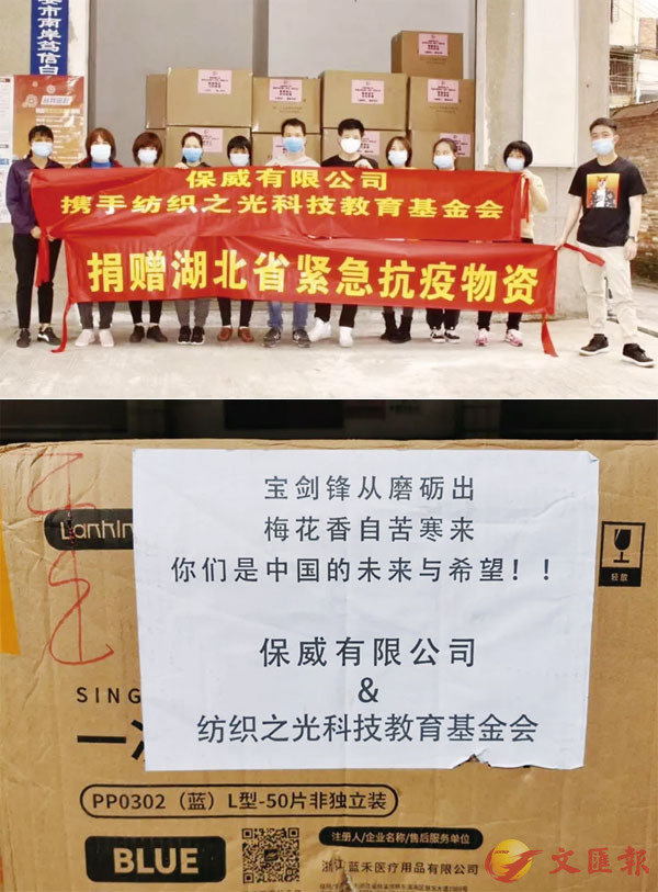 3月29日上午,本會副會長、香港保威有限公司董事長關淑敏攜手紡織之光科技教育基金會,將一萬個聯繫企業生產的口罩送贈武漢紡織大學,同時亦給武漢大學醫院和湖北省23間基礎醫院捐贈了3000件棉背心,克服運輸的重重困難,支持湖北省疫情防控工作!籍此給白衣戰士和師生們送上親切的關愛和溫暖!關淑敏表示,國家有難,人人有責!該司非常關注內地疫情狀況,希望能為湖北省抗疫作貢獻!■香港紡織商會