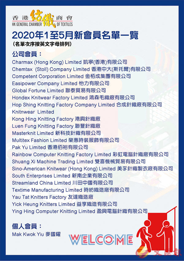 踏入2020年,本會會員人數節節上升,謹錄23名新會員名單如下,歡迎各會員踴躍向商會反映意見,探討如何幫助業界升級轉型;更多業界朋友與本會一同為行業爭取更美好環境,將香港紡織行業帶到去世界各地作推介。期待與新會員一齊攜手推展香港紡織行業,亦謹祝各新舊會員業務蒸蒸日上,再創高峰! ■香港紡織商會