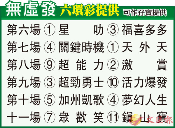 第六場「星叻」今季在草地久攻不下,如今落班重返勝途加添新鮮感出擊,廄主羅富全有針對性部署,顯然並非無的放矢,論馬狀態長期維持相當穩定,絕對有本錢在此變身。「福喜多多」上場草地都跑近證明有勇態,返泥地威力大增可提升名次。