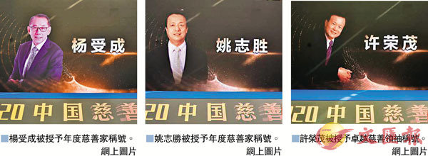 香港文匯報訊 第十七屆(2020)中國慈善榜日前發布,今屆共有118位(對)慈善家上榜,合計捐贈54.5036億元,包括本港三位企業家。其中,英皇集團主席楊受成和全國政協委員、統促會香港總會會長姚志勝獲頒「年度慈善家」殊榮,全國政協常委、港僑聯會主席許榮茂獲授予卓越慈善領袖稱號。