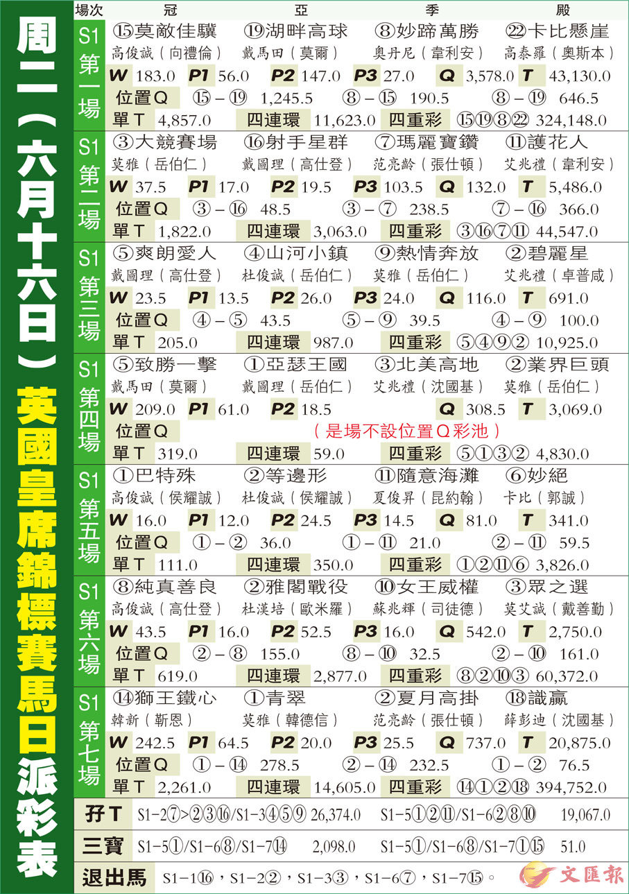 周二(六月十六日)英國皇席錦標賽馬日派彩表