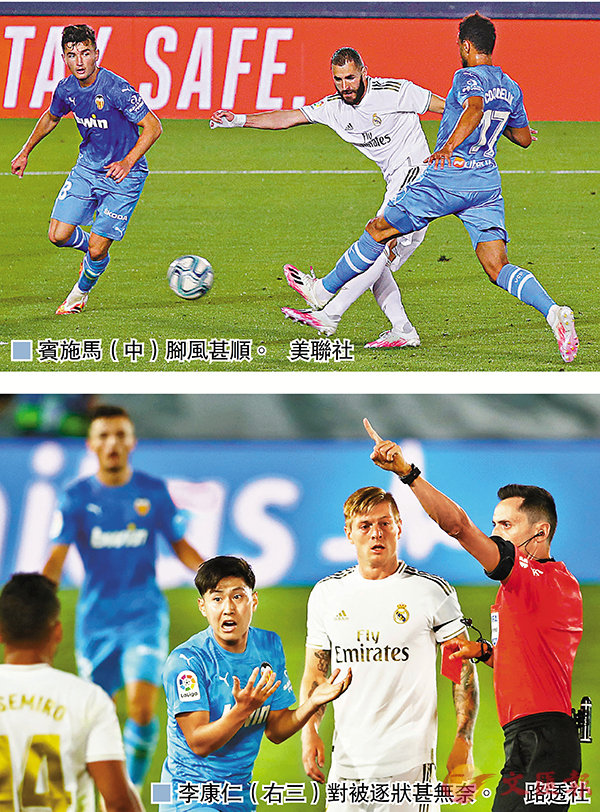 香港文匯報訊(記者 楊浩然)皇家馬德里於香港時間周五凌晨西甲登場,結果「銀河艦隊」以3球淨勝有李康仁被逐的華倫西亞,賽後維持只落後巴塞兩分;此外,是役梅開二度的射手賓施馬,則超越名宿普斯卡斯成為「皇馬」隊史第5位射手。