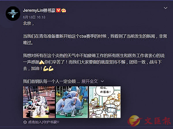 因疫情而暫停四個多月的CBA聯賽今日重啟,北京首鋼前NBA球星林書豪在社交媒體發布了兩張醫護人員辛苦工作的圖片(圖),感謝抗疫醫護人員。林書豪還表示,首鋼隊將傾盡所有,為北京而戰。