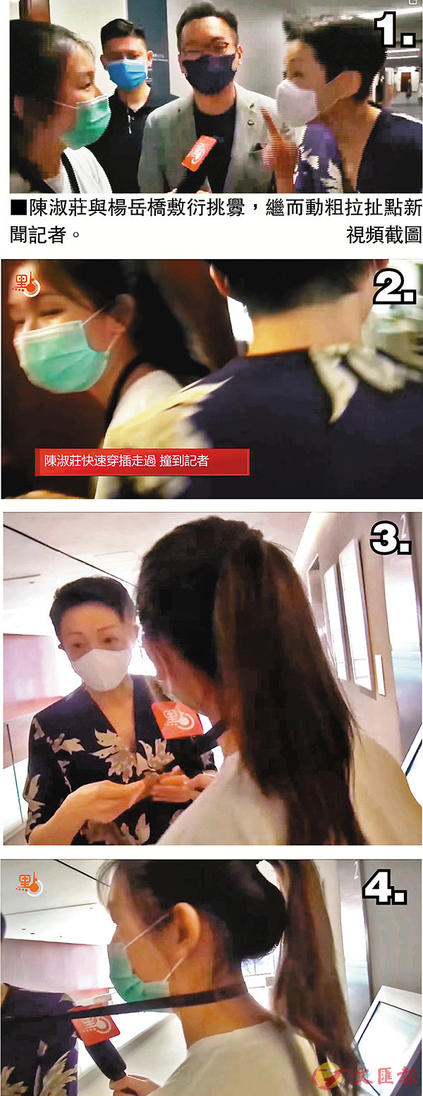 陳淑莊故意打斷記者對楊岳橋的訪問,記者隨即追問與陳淑莊、楊岳橋走向同一房間的公民黨議員譚文豪同一問題,譚文豪完全不理會。此時,陳淑莊突然衝向前,故意撞開記者和攝像機,然後在鏡頭前和楊岳橋及轉頭走向鏡頭的譚文豪一起做騷,聲言要人「小心個人資料」,但就戴頭盔稱不等於讓人不要申請,一人一句態度張狂地刁難記者。