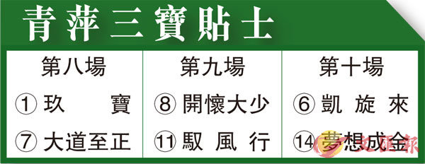 第十場、第三班、一○○○米(草地)。「凱旋來」今季只得一勝,贏馬一役在谷草千二壓倒「紅星」贏馬,到季中列陣二班直路賽,能與「遨遊戰士」串Q,當時馬兒評八十五分,但係經過下半季寓賽於操,目下減至七十四分再爭此程,又抽埋有利十四檔起步集有利條件於一身,冷膽在此。