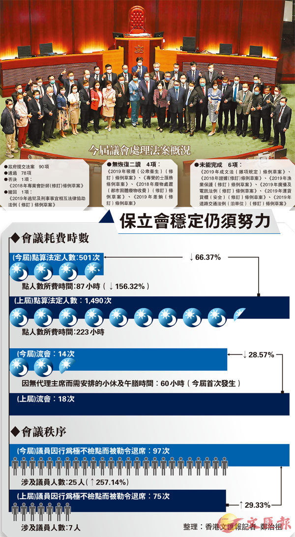 立法會昨日舉行今屆會期最後一次大會,繼續審議因攬炒派拉布而積壓的議案,最終在建制派議員齊心合力下,迅速通過了5項法案,但仍餘下6項涉民生的涉案仍未審議,須留待下屆議會處理。