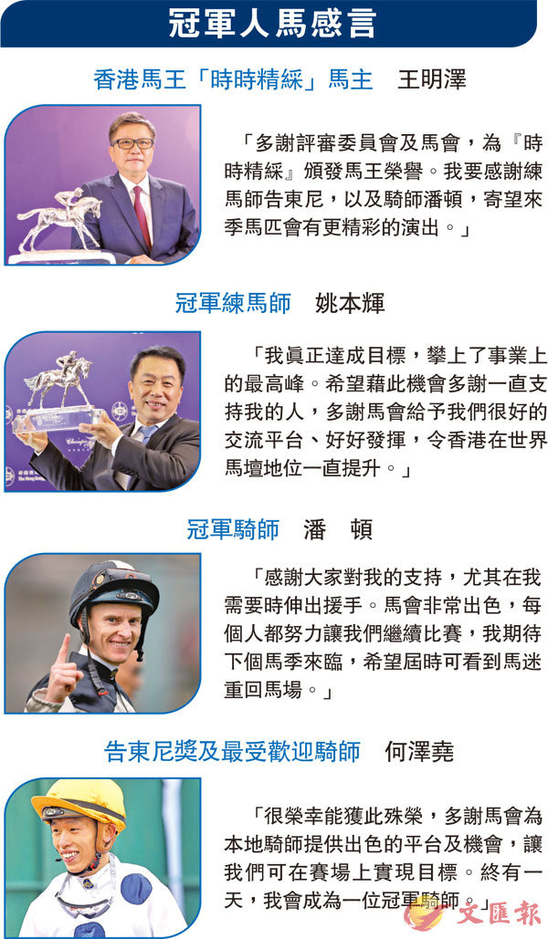 「多謝評審委員會及馬會,為『時時精綵』頒發馬王榮譽。我要感謝練馬師告東尼,以及騎師潘頓,寄望來季馬匹會有更精彩的演出。」