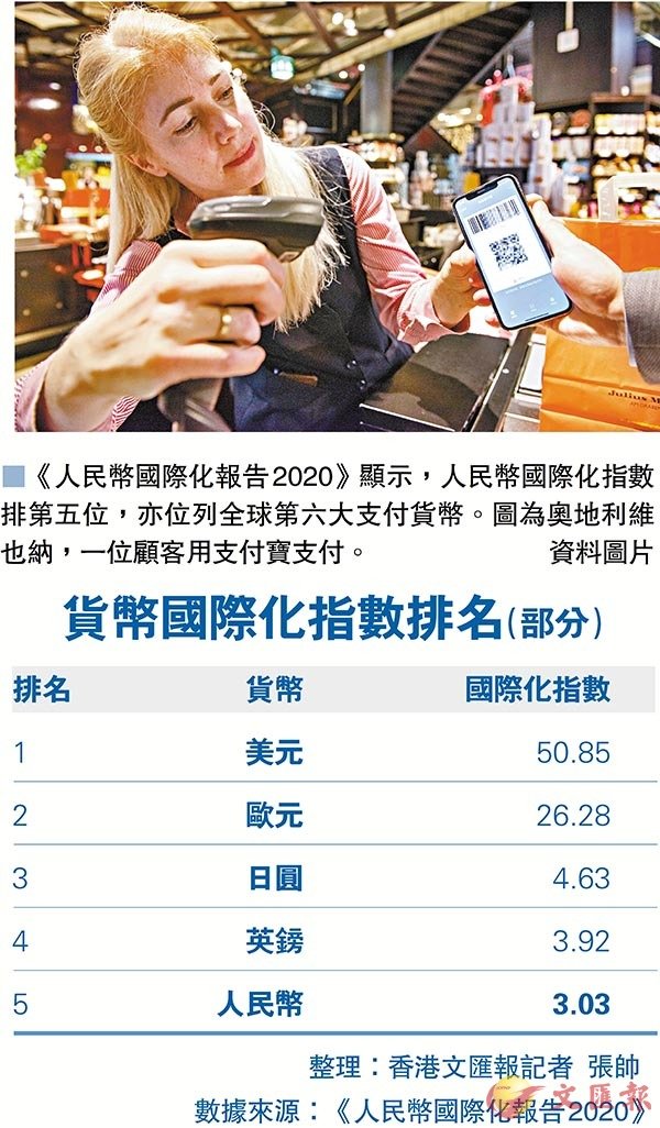 人民幣國際化指數排第五 列第六大支付貨幣 逾60央行作為儲備資產