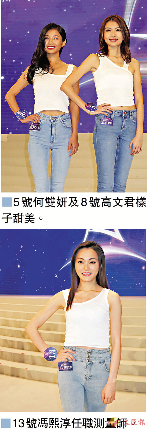 5號何雙妍與8號高文君樣子較甜美搶鏡,為自由身演員26歲的何雙妍身材則較輸蝕,三圍僅31、25、35,她因為參選撞期已推掉兩個工作,其中一個廣告酬勞也接近有一萬元,現再接工作則要向亞視申報。她表示有信心自己能入圍15強,更希望爭取更高名次。22歲的高文君則來自安徽,現於香港大學修讀土木工程雙學士學位,由於不懂講廣東話,她自感較輸蝕。