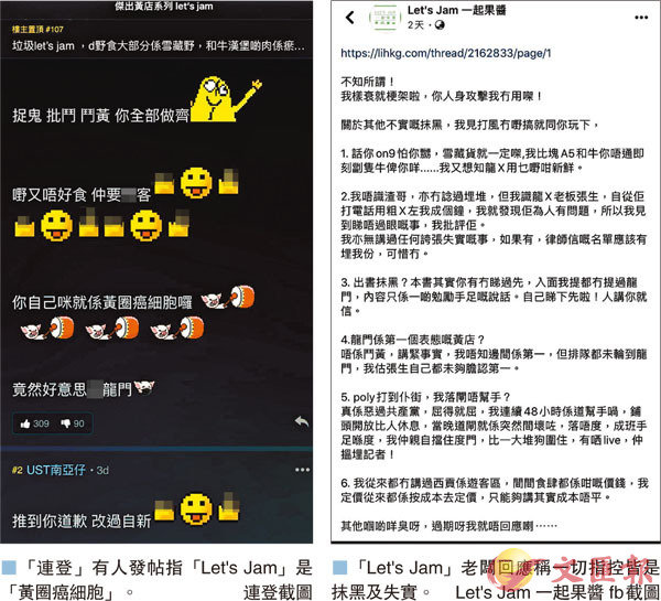 為鬻Q益,「黃圈」互片已經係一件常事。近日「黃店」「Let's Jam一起果醬」就被人騿u連登」上開post喪鬧,話佢間店浀n鬼難食,又指店老闆想埋「渣家軍」堆,成日針對「人血龍門」喎。不過,「Let's Jam」都不甘示弱,直接鐪b開post反擊齱u黃絲」,話「連登」上黚d言都「不知所謂」,全都係失實同抹黑喎。雙方鬧得不亦樂乎,有網民就直言「黃圈真係好恐怖」。