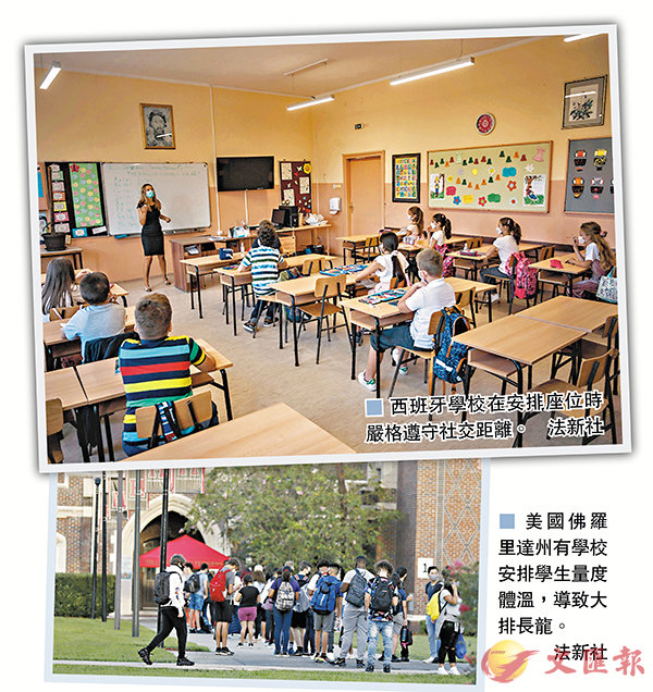 法國前日新增逾5,000宗確診,在歐洲國家中最多。當局要求所有教師及年齡介乎11歲至18歲的學生,不論身處室內還是室外,都必須佩戴口罩。英國當局也於上周三修改防疫指引,建議所有11歲至18歲學生和教職員,在走廊和課室以外的地方戴口罩。西班牙則頒布嚴格防疫措施,規定所有6歲以上學生必須全日戴罩、保持1.5米社交距離及每天至少洗手5次,為減少每班人數,政府將會增聘教師。當局強調各地區在上述全國強制措施基礎上,可自行制訂安全復課計劃。