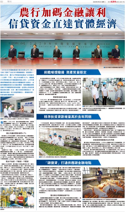 通過出台支持政策,農行還加大普惠金融投放力度,截至6月末,普惠型小微企業貸款餘額8,661億元,較年初增加2,738億元,增速46.2%,高於全行貸款增速37.3個百分點;有貸客戶數150.34萬戶,比年初增加39.43萬戶;普惠型小微企業貸款綜合融資成本較上年下降1.3個百分點,累計為3.5萬戶中小微企業和個體工商戶提供貸款展期、續貸等紓困支持。