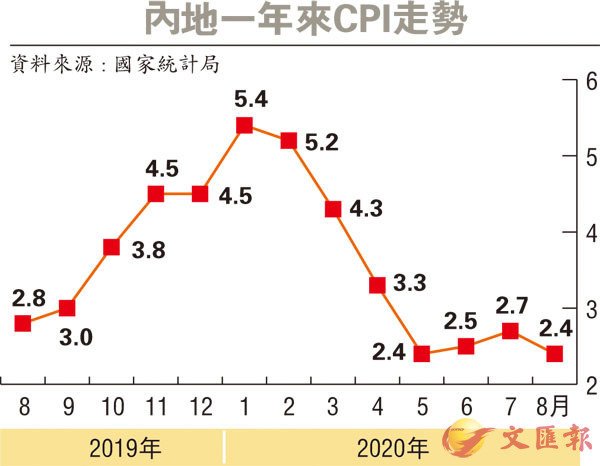 香港文匯報訊(記者 海巖 北京報道)豬肉等食品價格漲幅回落,帶動中國8月份居民消費價格指數(CPI)同比漲幅回落至2.4%,非食品價格、服務價格則從底部反彈,工業品價格繼續處於回升通道,工業生產者出廠價格指數(PPI)同比降幅繼續收窄至2%,顯示隨虒g濟回歸常態,居民終端需求正穩步回升,工業需求亦繼續恢復。