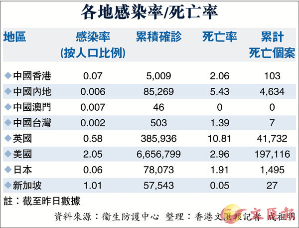 根據壎籵嬝@中心有2019冠狀病毒病報告個案的國家或地區的列表,香港文匯報記者以部分地區的人口、累計確診人數,以及死亡人數,計算其感染率和死亡率(見表)。香港的感染率和死亡率分別為0.07和2.06,兩個數值也較英美低,顯示香港防疫及治療措施,遠勝於有關地區。