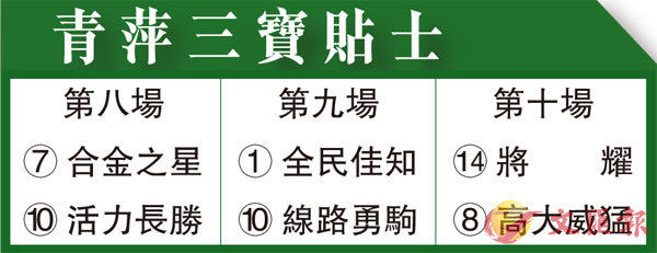 第九場、第三班、一四○○米。「全民佳知」上季曾嘗試越級挑戰,跑了經典盃和打m,但進度不及以致沒有作為,但經打m的洗禮後,回到普通三班賽,遇上今次水準較次的場合,復由何澤堯操刀人馬夾檔,憑茪瑰仱_步之利,小心放入三甲。