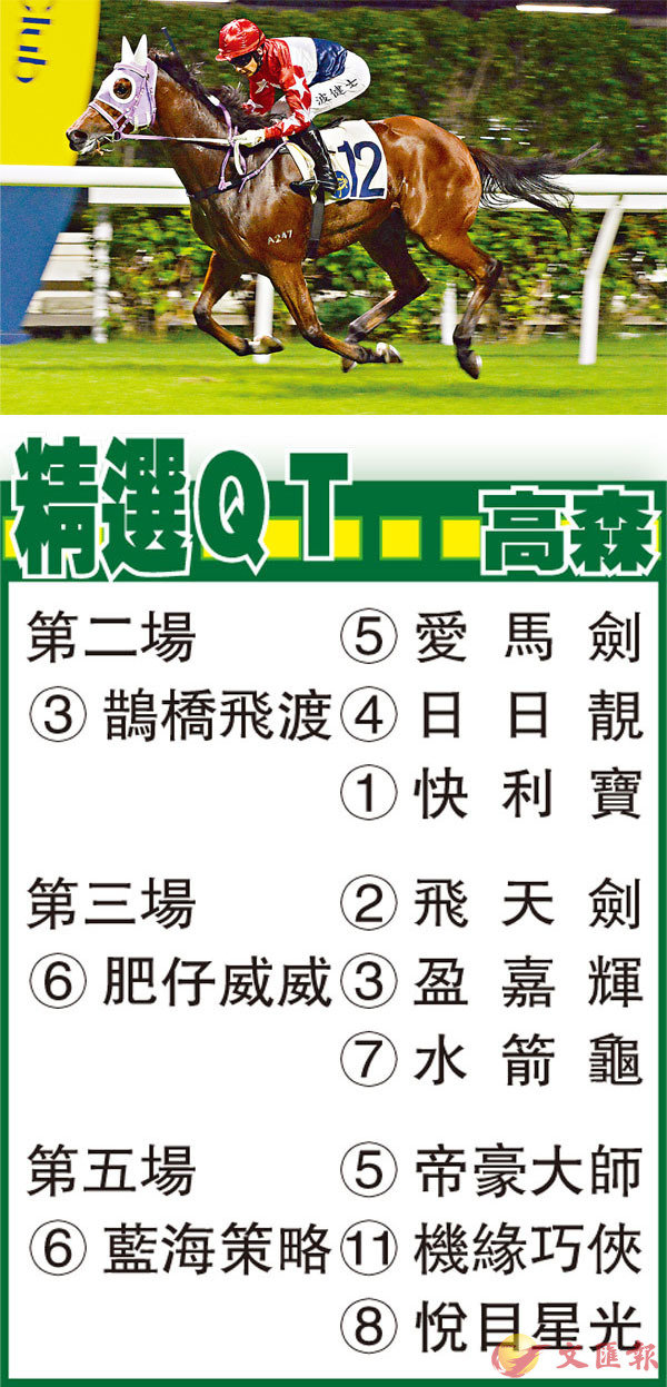 第二場、第四班、一六五○米。「鵲橋飛渡」今季轉賢廄初出即在此程一放到底獲勝;翌仗亦保持水準入Q,不敵勇馬「捉金皇」,練者已掌握到操養竅門,現趁勇態繼續打拚,同場相沖跑法馬甚少,添食在望。「日日靚」剛季尾於窄場千二影相僅敗後,再出增程一哩即順利補中;今季首戰跑短途已追獲殿軍,現回師贏馬路程應屬出擊時候。