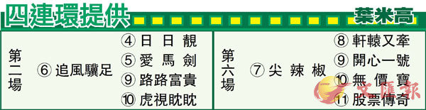 第六場、第四班、一二○○米。「尖辣椒」馬主周錦泉早在九十年代已開始養馬,早期以「草原」為名,其後改以「辣椒」為名,當中成就最好的一匹要數「紅辣椒」,此駒曾於○四年贏過三級賽百週年紀念銀瓶。唔講你唔知,周錦泉正是一代馬王「爪皇凌雨」已故馬主周南的弟弟。周錦泉近年養馬淡靜,對上一匹「辣辣椒」退役後,已較少見他入場,隔數年後再度養馬,今次以「尖辣椒」與沈集成初次合作,且看能否擦出火花,取得久違頭馬重新亮相凱旋門。